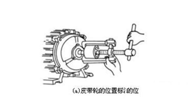 (a)皮带轮(或联轴器)的拆卸:先在皮带轮(或联轴器)的轴伸端(联轴端)做好尺寸标记,然后旋松皮带轮上的固定螺丝或敲去定位销,给皮带轮(或联轴器)的内孔和转轴结合处加入煤油,稍等渗透后,使锈蚀的部分松动,再用拉具将皮带轮(或联轴器)缓慢拉出,如图2所示。