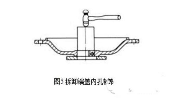 在拆卸端盖内孔轴承时,可采用如图5 所示的方法,将端盖止口面向上平稳放置,在轴承外圈的下面垫上木板,但不能顶住轴承,然后用一根直径略小于轴承外沿的铜棒或其他金属管抵住轴承外圈,从上往下用锤子敲打,使轴承从下方脱出。