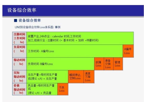 2、整体设备效率也可以作为>关键绩效指标和>精益生产的效率指标。整体设备效率有2个重要指标和5个次要指标。有紧密关系,也可以表示实际效率和理想的效率的差异。
