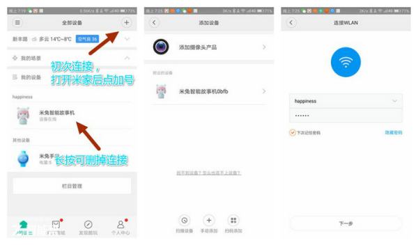 先同时按住米兔的左右领结,等黄灯亮起时,再开始手机上的操作。如图,从左至右,依次按提示操作输入WIFI密码。