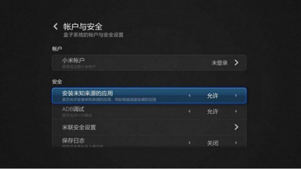 首先在进入小米盒子mini版主页选择“小米盒子设置”,找到”账户与安全“选项,将“安装未知来源应用”设置为允许