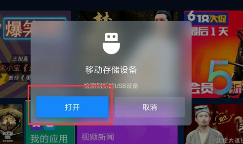 5、将U盘插入盒中。电视有一个弹出式提示。单击“打开”,如下图所示;