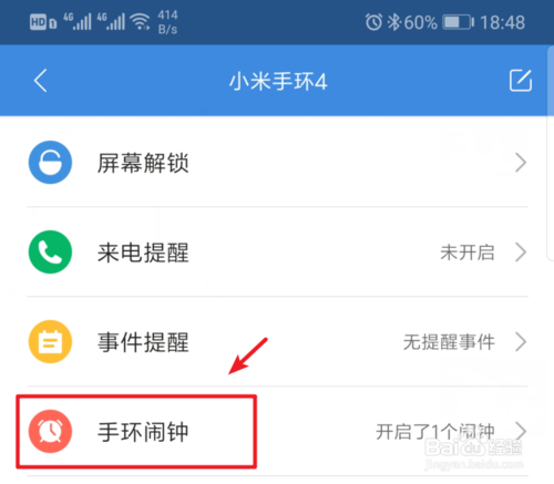 点击进入后,在手环设置界面,选择手环闹钟的选项进入。