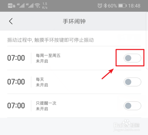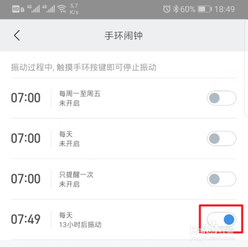 保存后,即可添加闹钟到小米手环4设备,如果需要关闭,在此界面点击后方的开关即可。