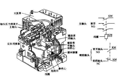 接触器主要由电磁系统、触点系统、灭弧系统及其它部分组成。 ①电磁系统:电磁系统包括电磁线圈和铁心,是接触器的重要组成部分,依靠它带动触点的闭合与断开。 ②触点系统:触点是接触器的执行部分,包括主触点和辅助触点。主触点的作用是接通和分断主回路,控制较大的电流,而辅助触点是在控制回路中,以满足各种控制方式的要求。 ③灭弧系统:灭弧装置用来保证触点断开电路时,产生的电弧可靠的熄灭,减少电弧对触点的损伤。为了迅速熄灭断开时的电弧,通常接触器都装有灭弧装置,一般采用半封式纵缝陶土灭弧罩,并配有强磁吹弧回路。 ④其它部分:有绝缘外壳、弹簧、短路环、传动机构等。 工作原理 当接触器电磁线圈不通电交流接触器起什么作用?