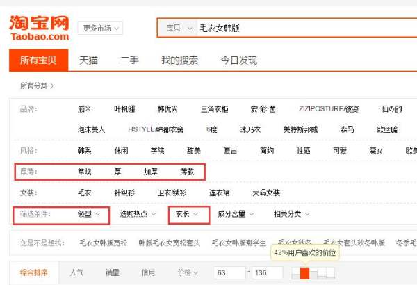 你如果想上首页,必须找到你精准的竞争对手。在这里告诉大家一个非常简单的方法,去界定你真实的竞争对手的。你在淘宝上搜索你的的核心权重词,比如你想竞争:毛衣女韩版,这个词。然后你在搜索结果页进行各种条件筛选,一般是价格+主要属性。比如你的毛衣准备卖128元,那你就看这个价格是在哪个区间的。