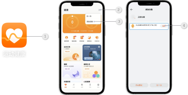 a.将穿戴设备靠近手机,在手机上打开华为运动健康应用,在界面右上角点击四个点> 添加设备,在扫描结果中找到您的穿戴设备,点击连接。