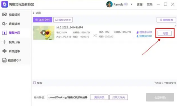 5.完成去水印的设置后回到视频水印窗口,点击“处理”等待片刻即可完成去水印操作。