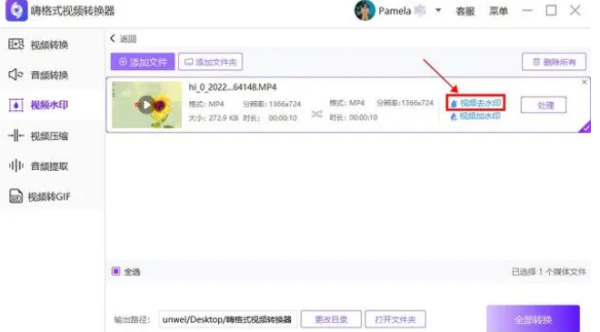 3.点击视频右侧的“视频去水印”,进入去水印设置窗口。