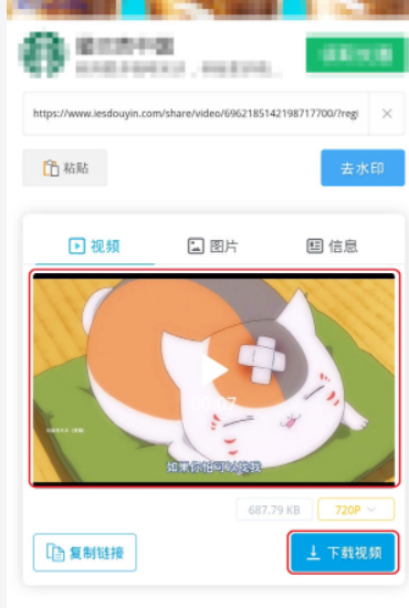 8、然后,在小程序的界面中,就可以获得去水印后的视频了,此时点击视频右下角的【下载视频】按钮。