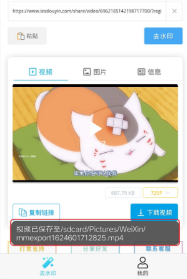 9、然后去水印后的视频就开始下载了,视频下载好一会,界面上会弹出【视频已保存至】的提醒信息。