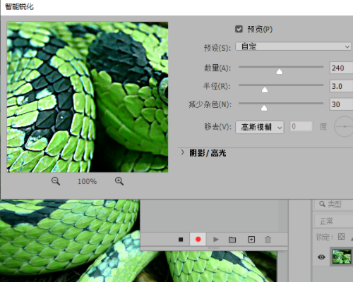 3、动作命令创建成功后开始记录动作,执行智能锐化效果,数值参考图片。