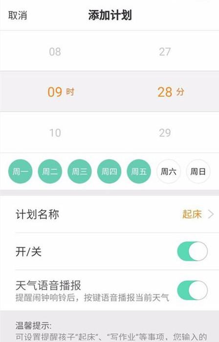 4、接下来,设定一下提醒的时间和计划名称。“起床”的计划中有天气语音播报的开关,开启后手表在孩子按掉提醒时,将语音播报今天的天气情况