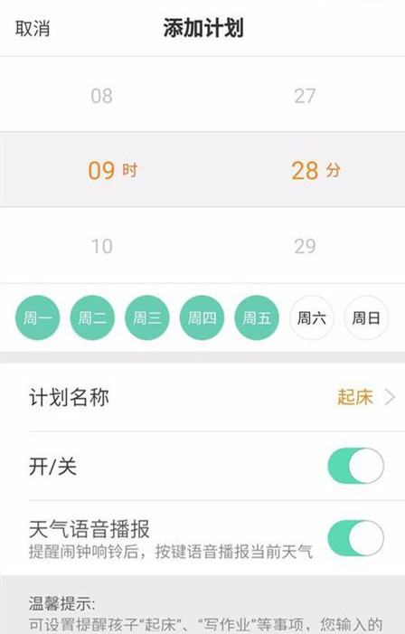 4.最后,设置提醒时间和计划名称。 “起床”计划中有一个天气语音广播开关。 开启手表后,当孩子按下提醒按钮时,手表将广播今天的天气。