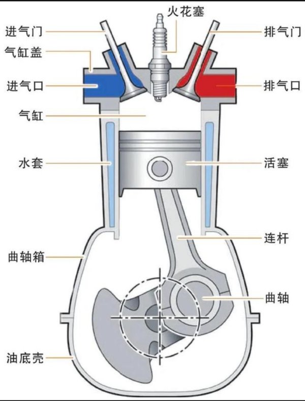 汽油机四冲程汽油机的剖面图汽缸的具体范围包括曲轴和连杆旁边吗?