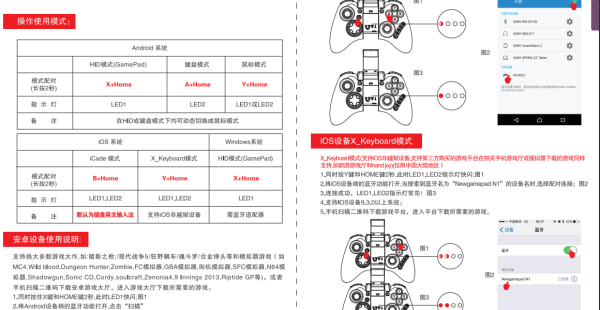 iPega蓝牙手柄有四种模式选择,iOS用户一般选择iCade模式即可,而此模式也只兼容iOS。具体使用方法为:长按“Y”键,然后按“Home”键,此时蓝牙LED灯则转换为橙色快闪状态;此时打开iPhone5蓝牙,选择BluetoothGamepad连接;连接成功后快闪状态橙色LED灯则转变为常亮装套。关闭方法:持续按“HOME”键约5秒,直至蓝牙LED熄灭,即手柄关机成功;手柄关机后,若手机未取消配对连接,只需再次长按“HOME”键约5秒,直至LED慢闪,即表示手柄已开机(默认上次开机模式),开机后手柄会自动与手机进行配对连接,若连接失败,手柄会自动关机。此外,这款手柄还有一个人性化的软件设求ipega蓝牙手柄使用说明书