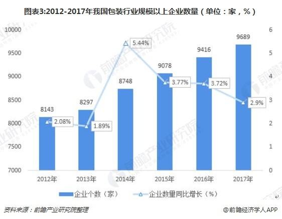 受我国国民经济持续快速增长的带动,我国包装行业也实现了飞跃式快速发展,巨大的市场发展空间和优越的发展环境吸引了众多跨国企业和民营资本进入到包装行业。目前,国内从事包装行业的企业数量众多,包装行业的集中度比较低,处于市场化程度较高的充分竞争阶段。数据显示,2014-2017年我国包装行业的规模以上企业数量呈现逐年增长趋势,同比增长趋于平稳状态,截止2017年我国包装行业企业数量达到9689家,同比增长2.9%。