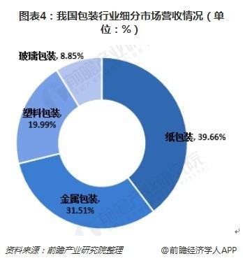 目前,中国市场上应用最广泛的是纸质包装和塑料包装产品,其次是金属包装和玻璃包装。据中国包装联合会的数据统计显示,2017年,纸包装、塑料包装、金属包装和玻璃包装合计实现营业收入9433.74亿元,纸和纸板制造占整个包装主营业务收入的 39.66%,其次分别为金属包装、塑料包装和玻璃包装,分别占比31.51%、19.99%和 8.85%。