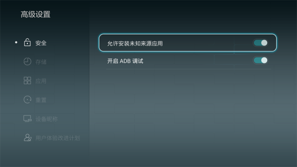 2、然后就是启动电视盒子,避免非系统自带的第三方未知软件的自动安装,很多盒子都有相关限制,所以首先需要进入系统打开“未知来源的应用”,才可以正常安装第三方,如下图分别三种设备的设置,统一进入系统设置相关选项修改。